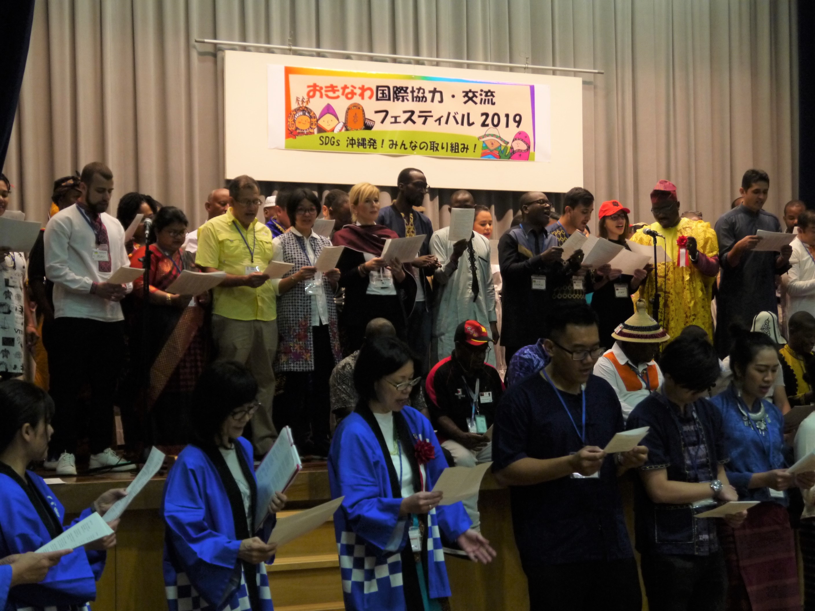 おきなわ国際協力・交流フェスティバルでは研修員全員で「島人の宝」を斉唱した