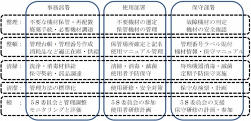 前記の図はもちろん開発途上国のそれぞれの国や地域、そして医療施設によりその管理体制が異なるなど、すべてのケースにこの方法が適応できるわけではない。特に保守部署のないところもあり、その場合は代理店やサービス会社などの支援も必要とする。また言い方を変えれば、使用部署の医療機材を事務部署と保守部署がどのように支援して5Sを実施するとも言い換えられ、どうしても3つに分けなければならないというわけでもない。おおよその目安として参考にされること願います。