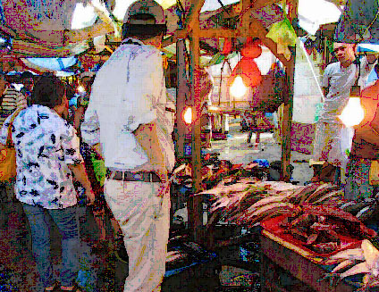 タクロバン魚市場で今晩の肴(あっ、いや魚)を物色中の筆者食生活といえば、タクロバン魚市場は外せません。マグロは見かけませんが、新鮮なカツオが1㎏=約270円程度で調達できます。店主が錆だらけの斧で「切るか?」と聞いてきます。せっかくのご厚意ですが、ここは丁寧にお断りして自室で捌いています。新鮮なアジやクエ、ハマグリ、さらに海ぶどうも等も安価で調達でき、週2日はこれらの海の幸を刺身などで楽しんでいます。